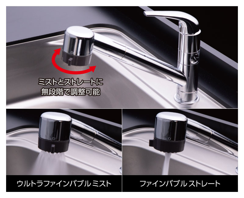 ウルトラファインバブルミスト吐水、ファインバブルストレート吐水は、レバーを回して切り替えます。無段階ですので、お好みの位置でご使用いただけます。
